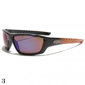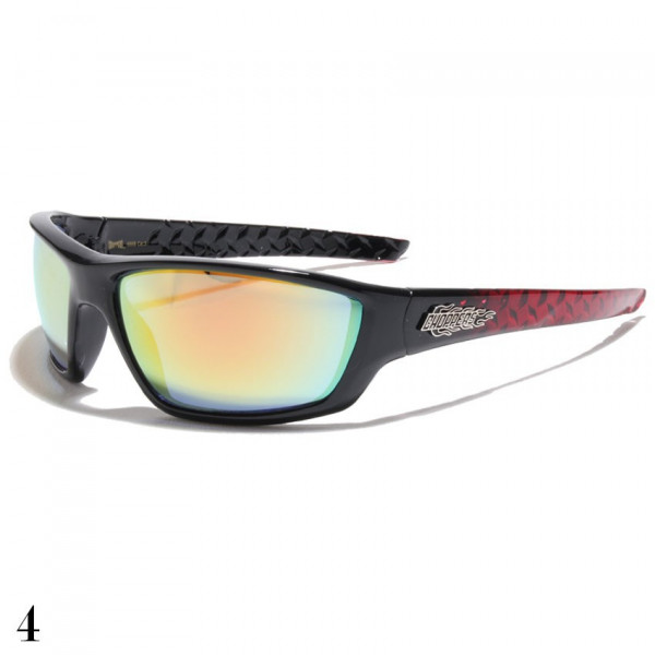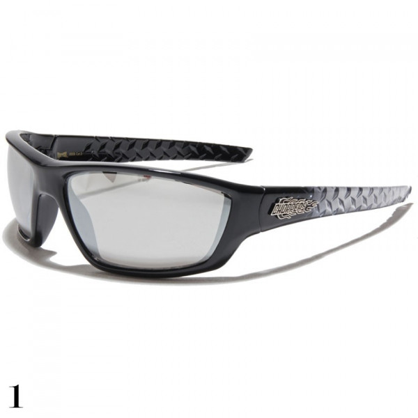Lunette de soleil Felon de chez Choppers, cadre rectangulaire en plastique robuste et léger, branches larges au dégradé de diamants structurés. Logo signature et flamme chromé. Lentilles de protection UV400 catégorie 3.