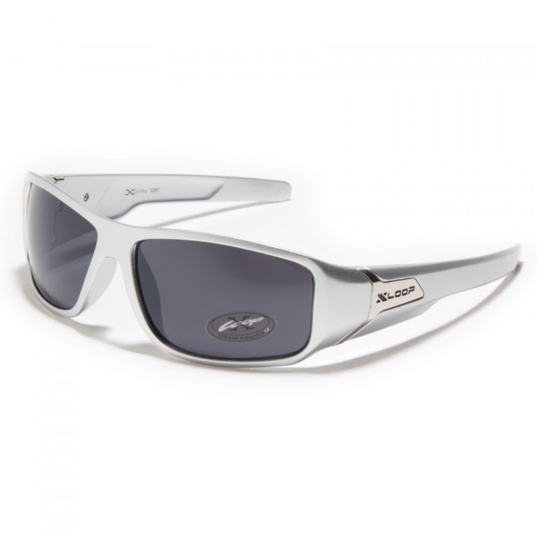Lunette de soleil modèle Jagger, monture robuste et légère en plastique gris, branche large, lentilles vision grise, charnière et logo Xloop chromé.