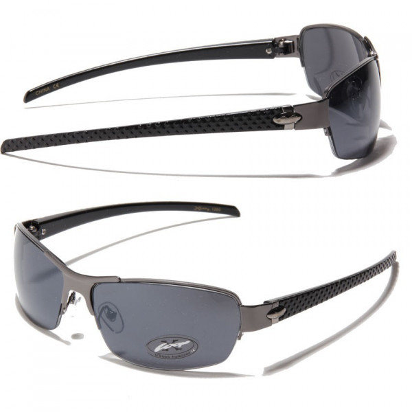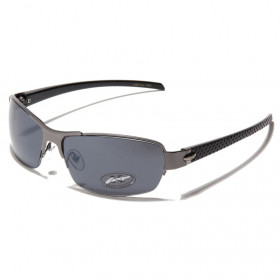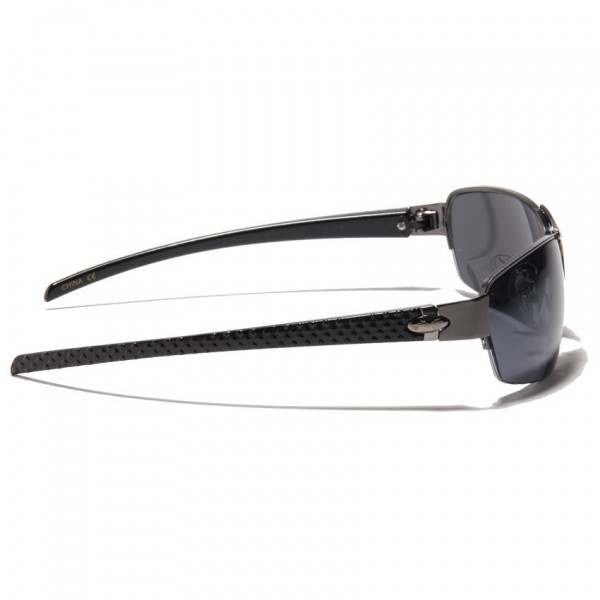 Lunette de soleil de style sportive cadre en métal, lentille polycarbonate vision grise, branches fines en plastique noir, protection maximale UV400.