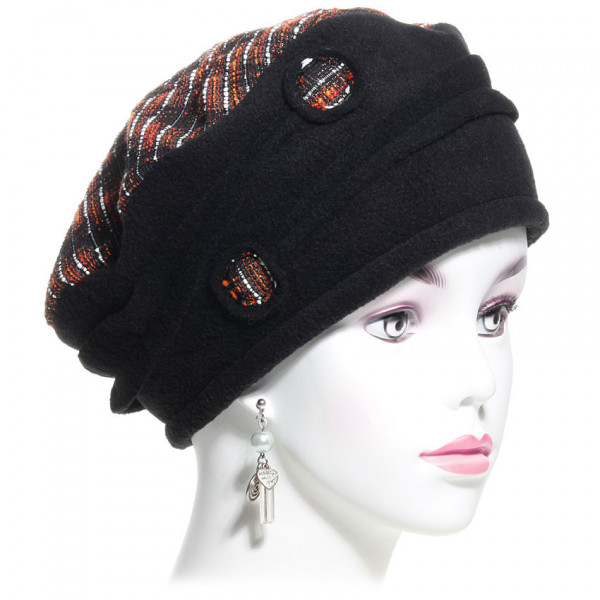 Joli béret mode en laine polaire de coloris noir, la galette est recouverte d’un tissus brillant aux tons orange assez original. Ce béret à aussi l'avantage d'être imperméable. Tout y est charme, douceur et chaleur.