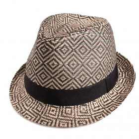 Élégant et original chapeau de paille rigide de forme trilby pour un look tendance cet été. A la plage comme à la ville, portez ce chapeau aux losanges multiples. Très belle finition, galon en tissu noir.
