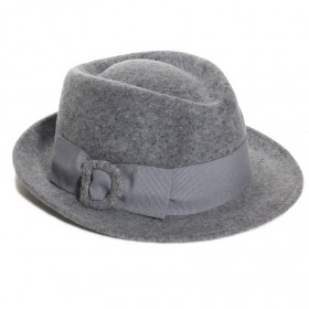 Chapeau feutre pour femme 100% laine couleur gris clair chiné, style trilby, petit bord, arrière relevé, calotte forme poire, gros grain noir et boucle laine . Taille unique 55/57cm. Fabriqué en Italie.